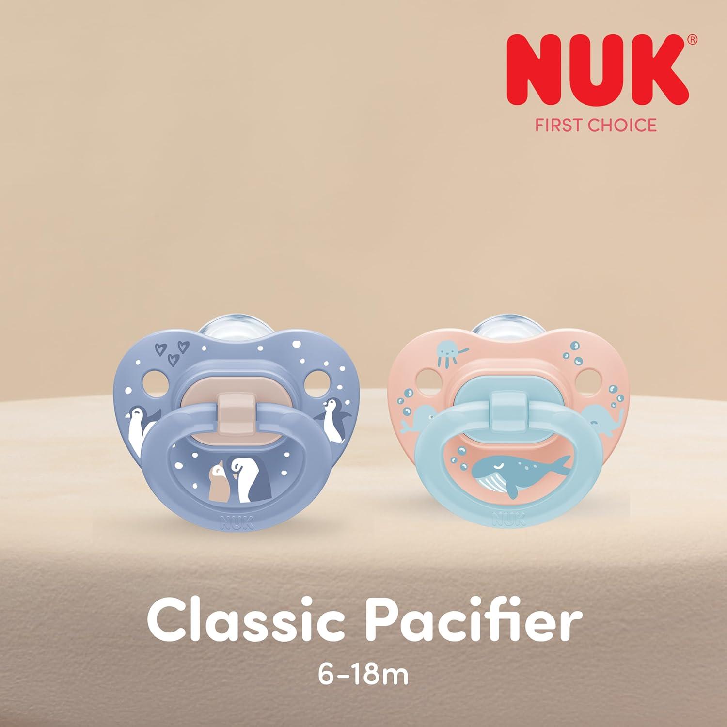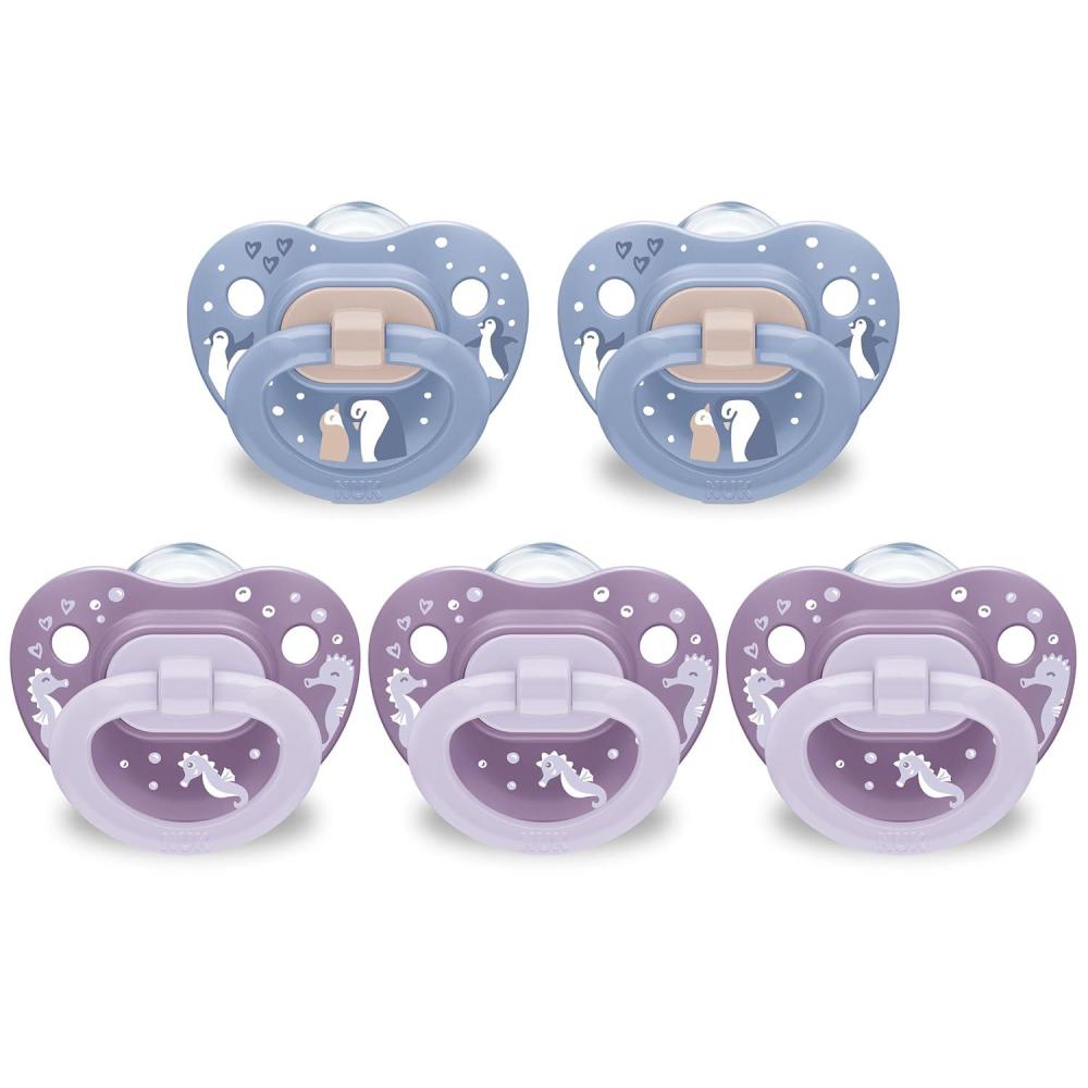 NUK First Choice Classic Orthodontic Pacifier, 6-18 Months Baby Pacifier, Purple & Blue, Baby Must Haves, 5-Pack(Purple & Blue)
