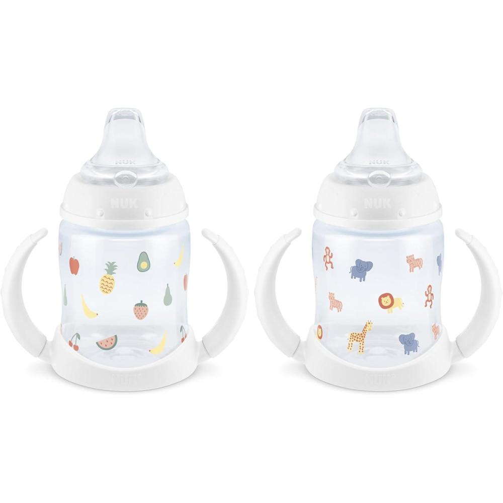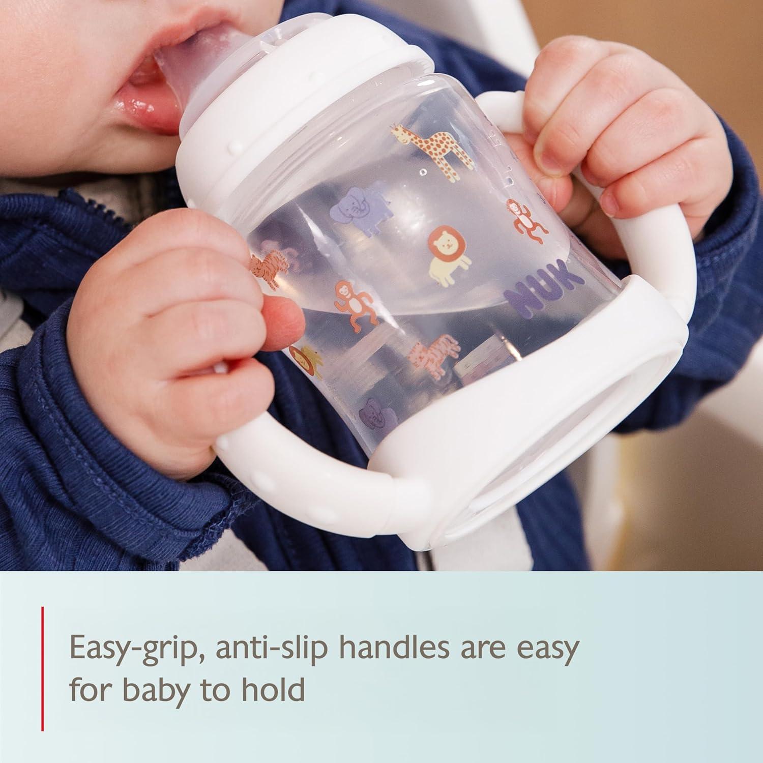 The NUK Learner Cup easily promotes a natural transition to baby's first cup. This learner cup features a spill-proof soft spout that is gentle on teeth and gums, and it includes an air vent that helps reduce swallowed air. The cup also comes with easy-to-grip, removable handles that your growing child will love. NUK Learner Cups are BPA-free and dishwasher-safe. Our 5-oz. learner cups are recommended for ages 6 months and older.
