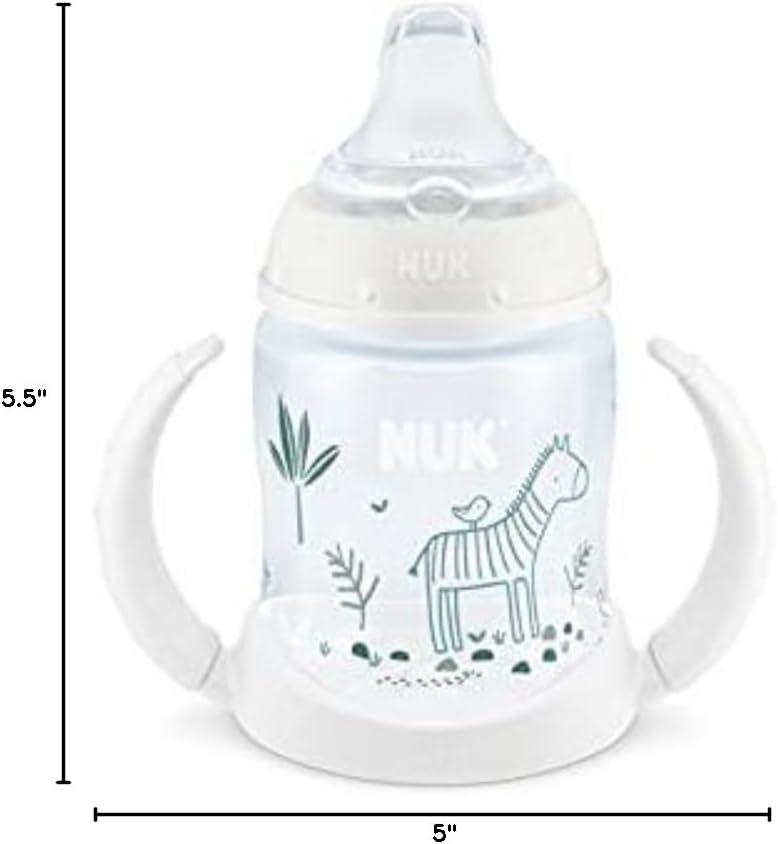 The NUK Learner Cup easily promotes a natural transition to baby's first cup. This learner cup features a spill-proof soft spout that is gentle on teeth and gums, and it includes an air vent that helps reduce swallowed air. The cup also comes with easy-to-grip, removable handles that your growing child will love. NUK Learner Cups are BPA-free and dishwasher-safe. Our 5-oz. learner cups are recommended for ages 6 months and older.